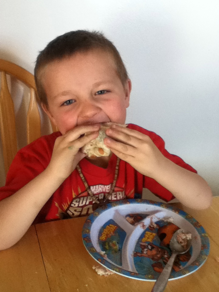 Tristan made himself a "sandwich" after school today. After snarfing it down, he declared it to have been "the best sandwich ever". I thought I'd share the recipe: